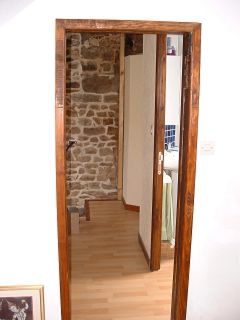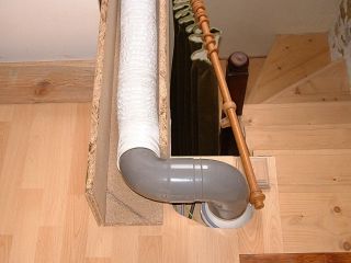 So..... not much new to show at my place: mainly minor jobs. The main work involved removing some existing work in the stair/kitchen area to feed electric through to power, and switch, an extractor fan. This also involved a hole through the back wall and a start on making up a trunking to take the extractor discharge ... to be finished next trip. Apart from this, wood trim was fixed permanently around doors etc. upstairs, and the floor covering extended and repaired near the stairs. The last job was to reposition and fix the stair curtain.