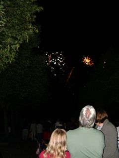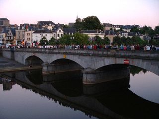This year the 14th July fireworks in Mayenne were less easy to see. The renovation work on the castle meant that the fireworks were presented from down the River Mayenne. At dusk people crowded the bridge, as well as the riverside car park, to get a view.