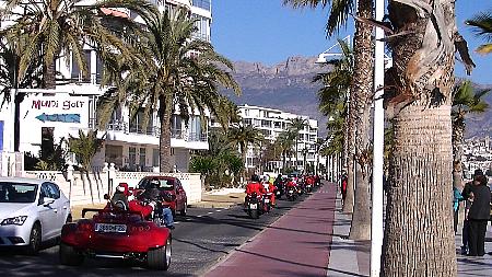 | Sunday was a particularly sunny day, and use was made of the coastal Ttram railway. Two got off at Teulada for a Christmas Market, I carried on to Altea, and after a coffee went for a walk along the promenade for a brief visit to The Kaktus Hotel, at Playa del Albir, to renew aquaintances, to learn about the free wifi - and where there was an invasion of about 100 or more Harley Davidson riders all dressed as Father Christmas. | ![]() |
