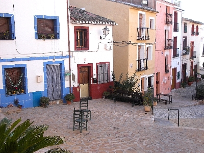 Inland - Finestrat village " square " with chairs for " storytelling ", and the church