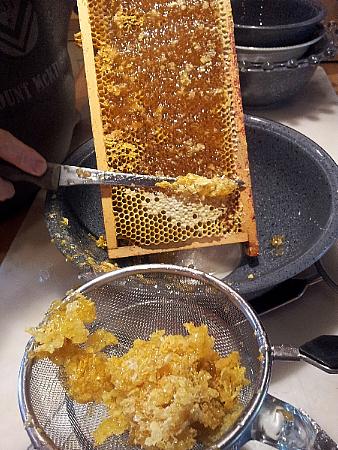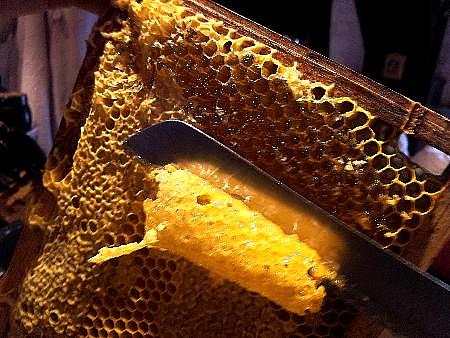 arrival of the bees at La Petite Reigniere. The beekeeping activity is now starting to yield some honey. The first batch was processed just before I left. It tasted good ... I understand what the bees feed on determines how it tastes. |