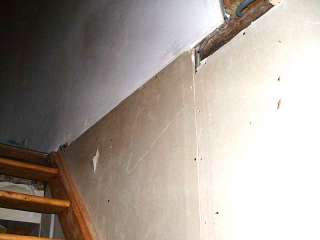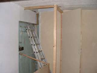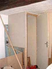 A beam was removed from the stairway to widen and improve access, and the exterior wall was insulated and plaster boarded ready for final decoration.