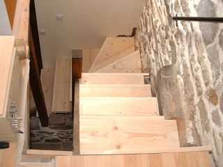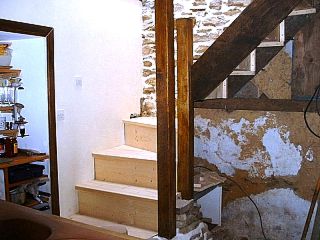 The main work this visit was to finish the stairs and create more kitchen space. A large tiled area and deep shelf under the new stairs has provided considerably more storage. The wall has been part tiled, to give a clean surface, but an area of the main stone wall was revealed and will be left to eventually provide a feature. The next job will be to install an extractor fan, which will also ventilate the shower room. |