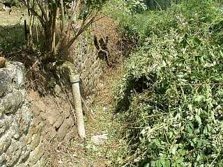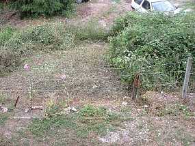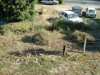 A first job was to tackle the " lower ground " where stinging nettles and brambles had grown to well above head height ! The pipe against the wall is about 5 ft in height ( it carries the rain water from the roof - and could be useful later for a garden water supply)