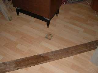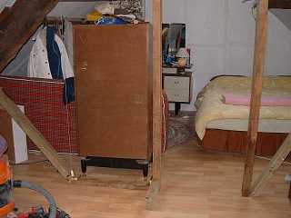Back at the house, the upstairs A frame was altered to provide a head height walk through, although I was still ducking automatically for a few days after ! The frame was braced against uprights, which went through the floor to rest on the main beam below and against the floor joists.