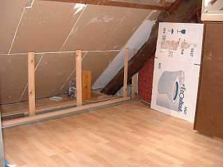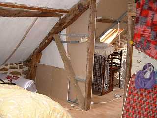 Further struts will be added in the construction of the partition wall, which also houses some of the electrics. Most of the timbers on the bedroom side will still be visible since the plasterboard panels will be inset. |