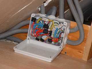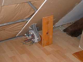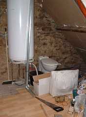 The mass of electrical wiring, as seen in earlier pictures, has been brought together in two main distribution boxes, to be fed from a new main fuse box. Most of the electrical work for the main house is now completed, apart from two or three power sockets, and a few lights and switches ( especially where walls etc. have to be built to hold them !)
