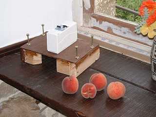 Two main power breakers have been box mounted ready to connect up the new wiring and fuse boxes to the EDF supply .... the peaches are from the garden. |