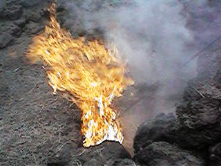 NATIONAL PARK of TIMANFAYA...Lanzarote. Water poured down the vent hole is back in 3 seconds as steam. ...A bundle of dry twigs and brush catches fire after about 20 seconds.