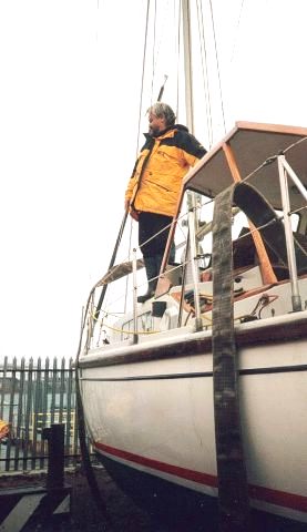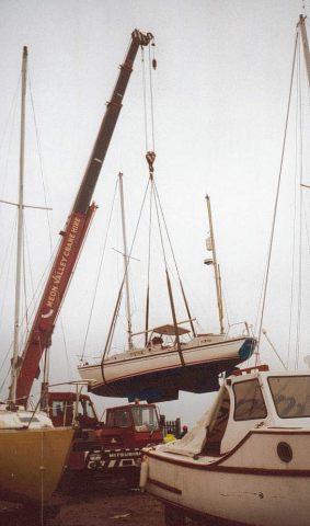 The weather was wet and grey, and I arrived with just minutes to spare. The straps were already under the hull, the crane alongside.