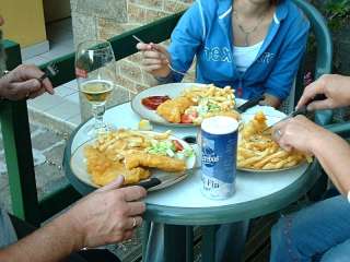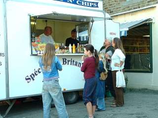 Once a fortnight a travelling ( English ) fish and chip van calls at a local bar. It usually brings in quite a crowd !
