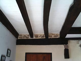 Inside, further work was done on the main room ceiling, ready for a final coat. Before this the main beams will need tidying. The lighting was improved, and more wall tiling completed, in the downstairs shower room / loo. Other work involved minor plastering / tradifarge pointing, and wood trims. |