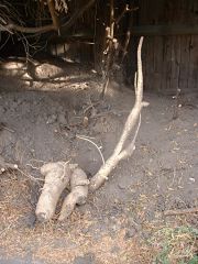 | Before I left for France I started work on the hedges. The huge root was about two thirds of the root of a vine, which grew every year in the leylandia hedge. Clearing the bottom growth should deter the foxes - who like to visit my back garden when I am away. | ![]() |
