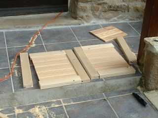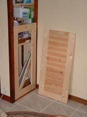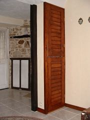 new downstairs cupboard, which I started last visit. These were then stained and hung. The cupboard was shelved, and now provides much needed storage, to help clear the room of tools and working material. An additional power point was installed. |